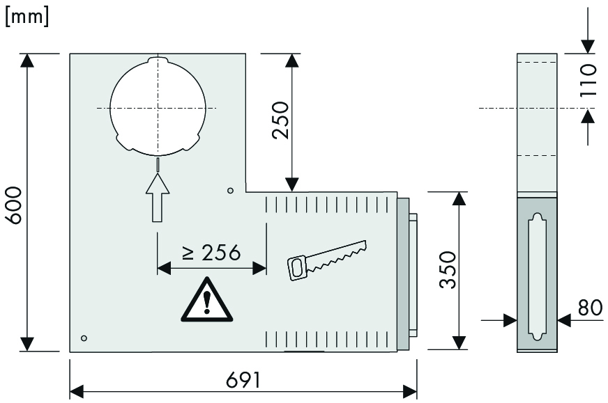 - 650 x 600 x 80 mm (B x H x T), Breite kürzbar um bis zu 260 mm